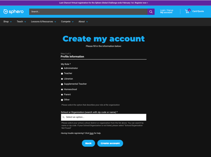 If you select, School User, there is one more step require to associate your new account with an existing record within Sphero’s system for schools/organizations.