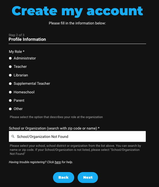If you are unable to locate your school/organization from among the options that Sphero’s system presents, you can submit a new organization by selecting, School/Organization Not Found.