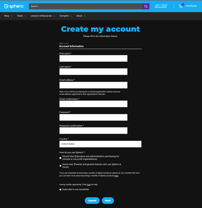 Please enter your personal details. If you will be making purchase of Sphero products in a school/organizational setting, you should select, School User. If you will be making purchase of Sphero products for home use or individual use outside of a school/organizational setting, you should select, Home User. You have the option to opt-in to Sphero’s newsletters at this time (not required).